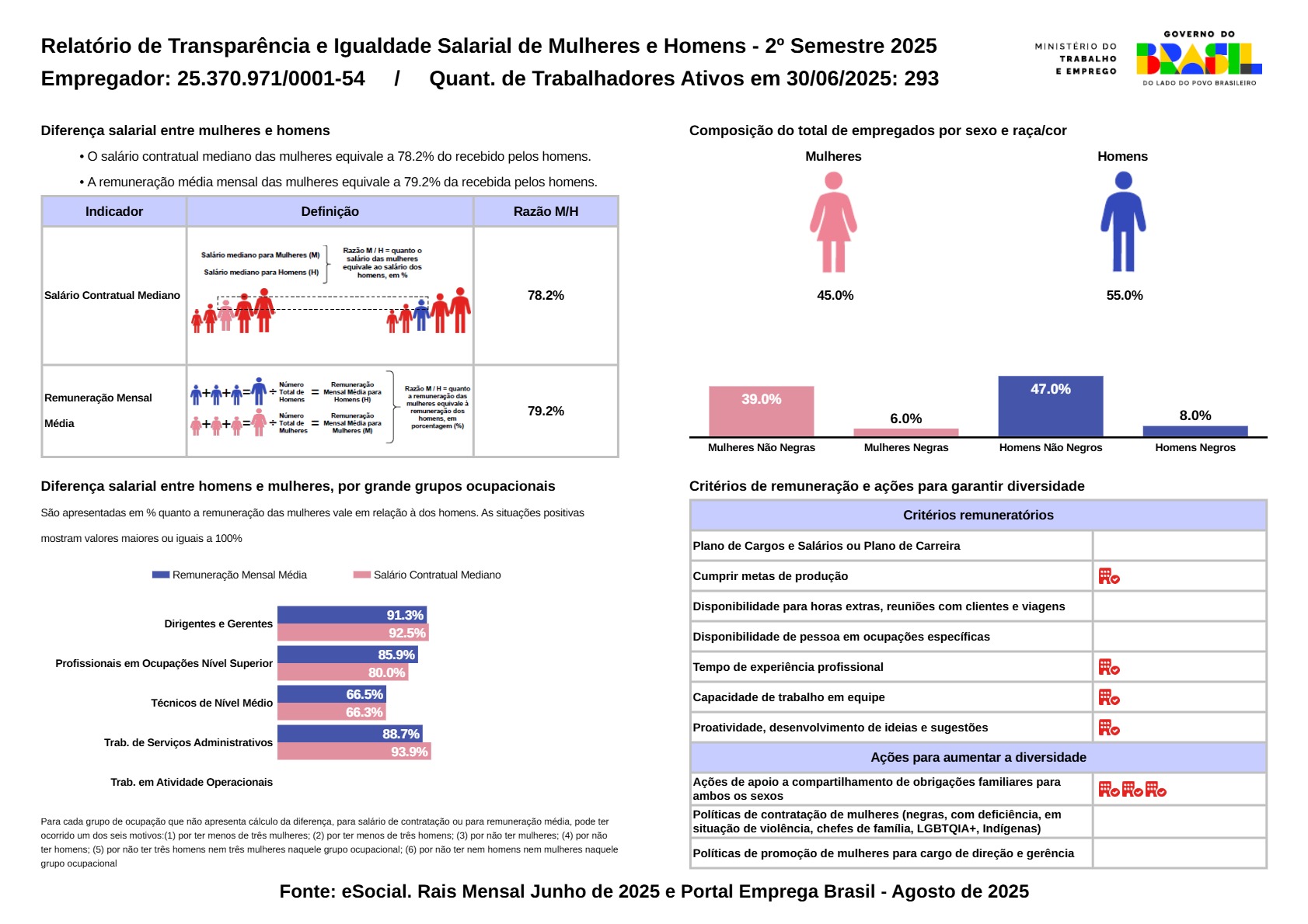 As informações do relatório foram elaboradas com base em metodologia desenvolvida pelo próprio órgão ministerial, nos termos da Instrução Normativa MTE nº 6/2024, e não observa os requisitos da Lei de Igualdade Salarial e da CLT. Ele compara de forma genérica os salários de mulheres e homens, desconsiderando nível hierárquico, grau de responsabilidade, atividade de trabalho, função efetiva, performance, tempo na empresa ou tempo na função, o que descumpre o artigo 461 da CLT e não evidencia corretamente o cenário da Enforce em relação a remuneração e oportunidades igualitárias de progressão de carreira entre homens e mulheres.